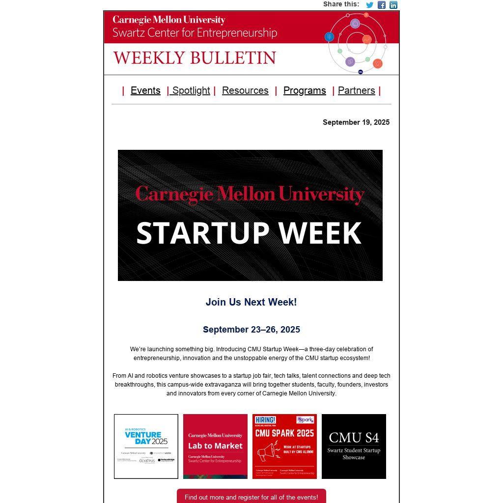 We’re launching something big. Introducing CMU Startup Week—a three-day celebration of entrepreneurship, innovation and the unstoppable energy of the CMU startup ecosystem!