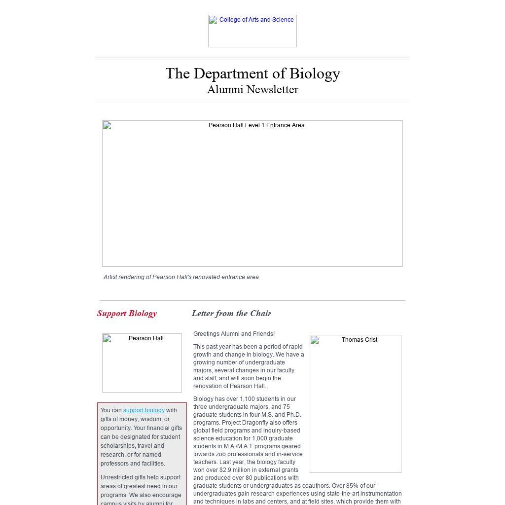 | Greetings Alumni and Friends! This past year has been a period of rapid growth and change in biology. We have a growing number of undergraduate majors, several changes in our faculty and staff, and will soon begin the renovation of Pearson Hall. Biology has over 1,100 students in our three undergraduate majors, and 75 graduate students in four M.S. and Ph.D. programs. Project Dragonfly also offers global field programs and inquiry-based science education for 1,000 graduate students in M.A./M.A.T. programs geared towards zoo professionals and in-service teachers. Last year, the biology faculty won over $2.9 million in external grants and produced over 80 publications with graduate students or undergraduates as coauthors. Over 85% of our undergraduates gain research experiences using state-the-art instrumentation and techniques in labs and centers, and at field sites, which provide them with hands-on skills that are valued by employers as well as graduate and professional schools. Our students continue to have successful careers in academics, industry, government and non-profit organizations. The renovation of Pearson Hall will support our changing needs for teaching and research, create new cutting-edge teaching and research labs, and provide a more open, collaborative and inviting environment for our students and visitors. Renovation plans for the first two years of the project are nearly completed, and construction will begin in May 2017. As the fall semester draws to close, we are celebrating the careers of Dr. Rick Lee and Dr. Jim Hickey and their outstanding contributions as teachers and scholars. Last year, Dr. Don Kaufman retired as director of the Hefner Museum of Natural History, followed by Cecilia Franz Berg, assistant director. Together, their vision and creativity brought environmental education and natural history to thousands of university and K-12 students, teachers, and visitors. Our new director Steve Sullivan, along with project manager Julie Robinson, will build on these successes to forge new ways of connecting science and environmental education to broad audiences. We are also excited to be searching for tenure-track faculty in plant developmental biology and global change biology. I wish you the all the best in the holiday season and in the New Year!