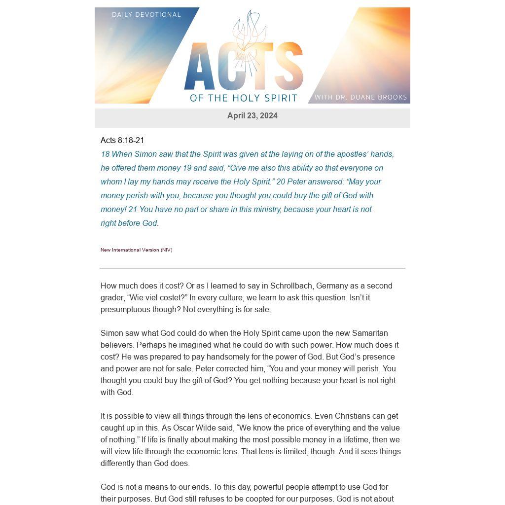 Simon saw what God could do when the Holy Spirit came upon the new Samaritan believers. Perhaps he imagined what he could do with such power. How much does it cost? He was prepared to pay handsomely for the power of God. But God’s presence and power are not for sale. Peter corrected him, “You and your money will perish. You thought you could buy the gift of God? You get nothing because your heart is not right with God.