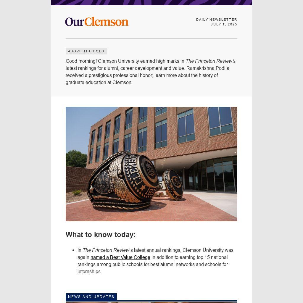 Good morning! Clemson University earned high marks in The Princeton Review's latest rankings for alumni, career development and value. Ramakrishna Podila received a prestigious professional honor; learn more about the history of graduate education at Clemson.