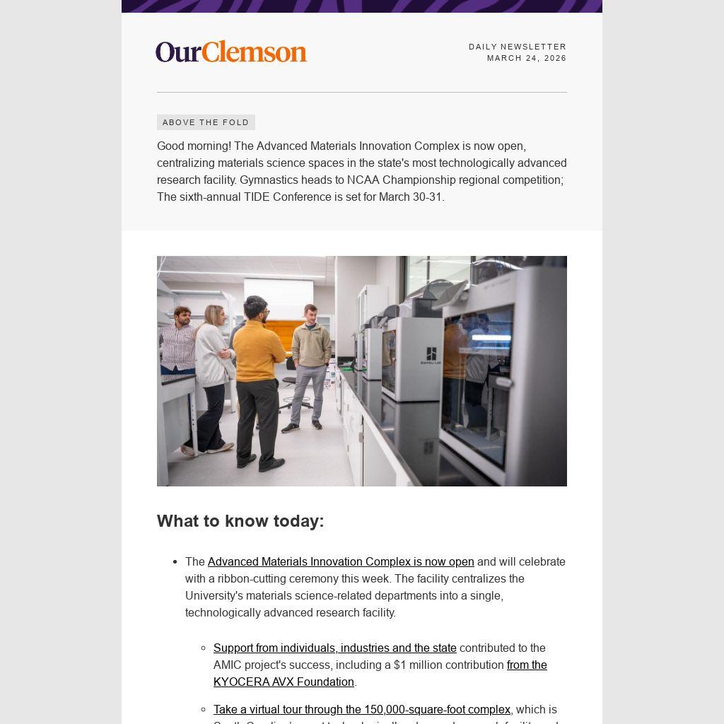 Good morning! The Advanced Materials Innovation Complex is now open, centralizing materials science spaces in the state's most technologically advanced research facility. Gymnastics heads to NCAA Championship regional competition; The sixth-annual TIDE Conference is set for March 30-31.
