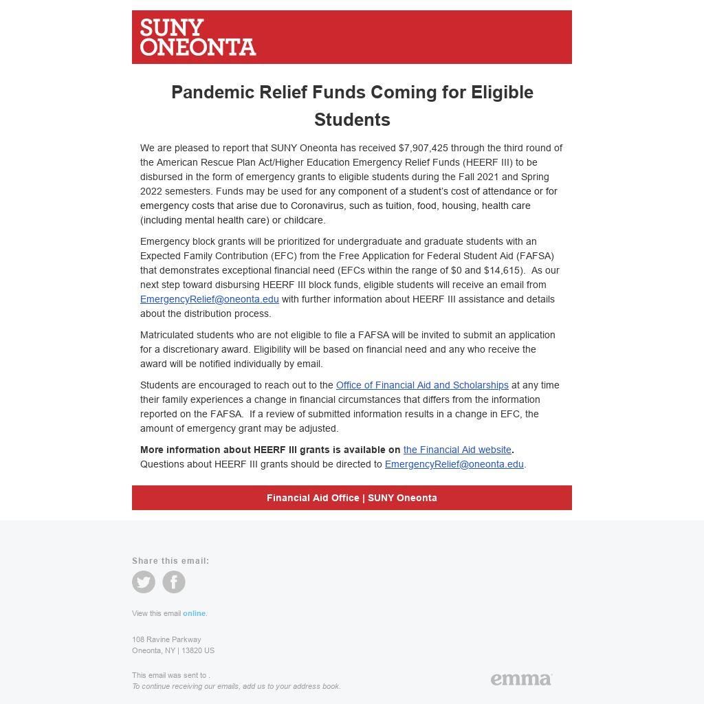We are pleased to report that SUNY Oneonta has received $7,907,425 through the third round of the American Rescue Plan Act/Higher Education Emergency Relief Funds (HEERF III) to be disbursed in the form of emergency grants to eligible students during the Fall 2021 and Spring 2022 semesters. Funds may be used for any component of a student’s cost of attendance or for emergency costs that arise due to Coronavirus, such as tuition, food, housing, health care (including mental health care) or childcare.