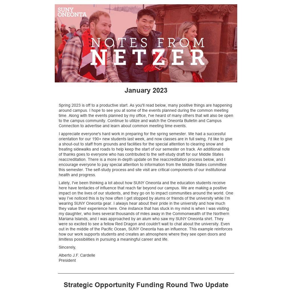 | Spring 2023 is off to a productive start. As you'll read below, many positive things are happening around campus. I hope to see you at some of the events planned during the common meeting time. Along with the events planned by my office, I've heard of many others that will also be open to the campus community. Continue to utilize and watch the Oneonta Bulletin and Campus Connection to advertise and learn about common meeting time events.