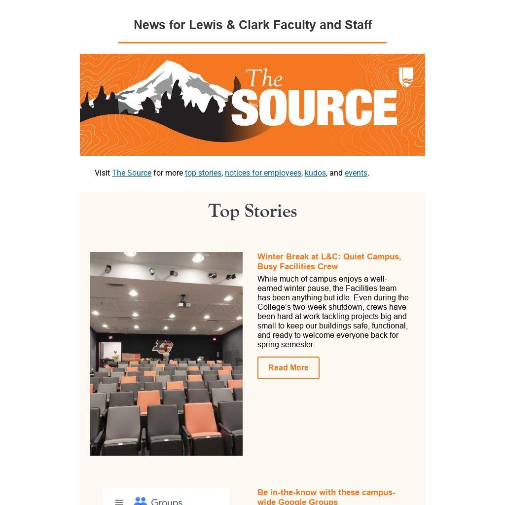 The Source is produced by Lewis & Clark's Office of Communications, and is distributed weekly to lc-employees@lclark.edu. Please write to us with your ideas, stories, and events—including specific date requests for promotion. Although there is no option for employees to unsubscribe, please do not mark this email as spam as doing so may negatively impact Lewis & Clark's reputation with Google as a trustworthy sender. Learn more about Lewis & Clark’s efforts to protect the email reputation of our lclark.edu domain.