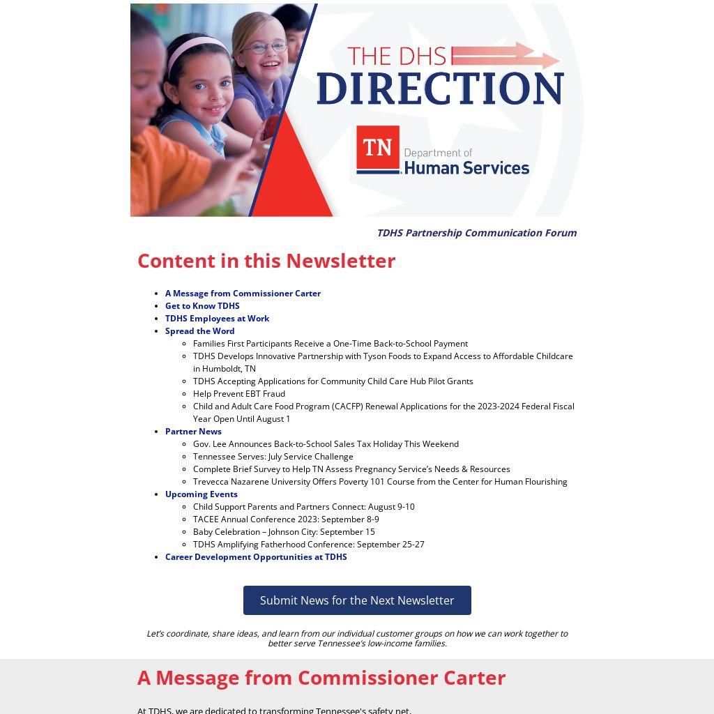 The Tennessee Department of Human Services (TDHS) consists of multiple divisions with a unified mission to build strong families by connecting Tennesseans to employment, education, and supportive services. Led by governor-appointed Commissioner Clarence H. Carter, TDHS serves nearly two million Tennesseans to ensure that all state residents have an opportunity to reach their full potential as contributing members of their community. Among the many services and programs provided by TDHS, some of the leading programs include the Child Support Program, Child and Adult Care Licensing, Families First (the state’s Temporary Assistance for Needy Families (TANF) program, Supplemental Nutrition Assistance Program (SNAP), Rehabilitation Services for people with disabilities, and Adult Protective Services, along with many others. TDHS is an organization committed to connecting people to resources that help individuals, families and communities thrive towards long-term economic freedom and prosperity.