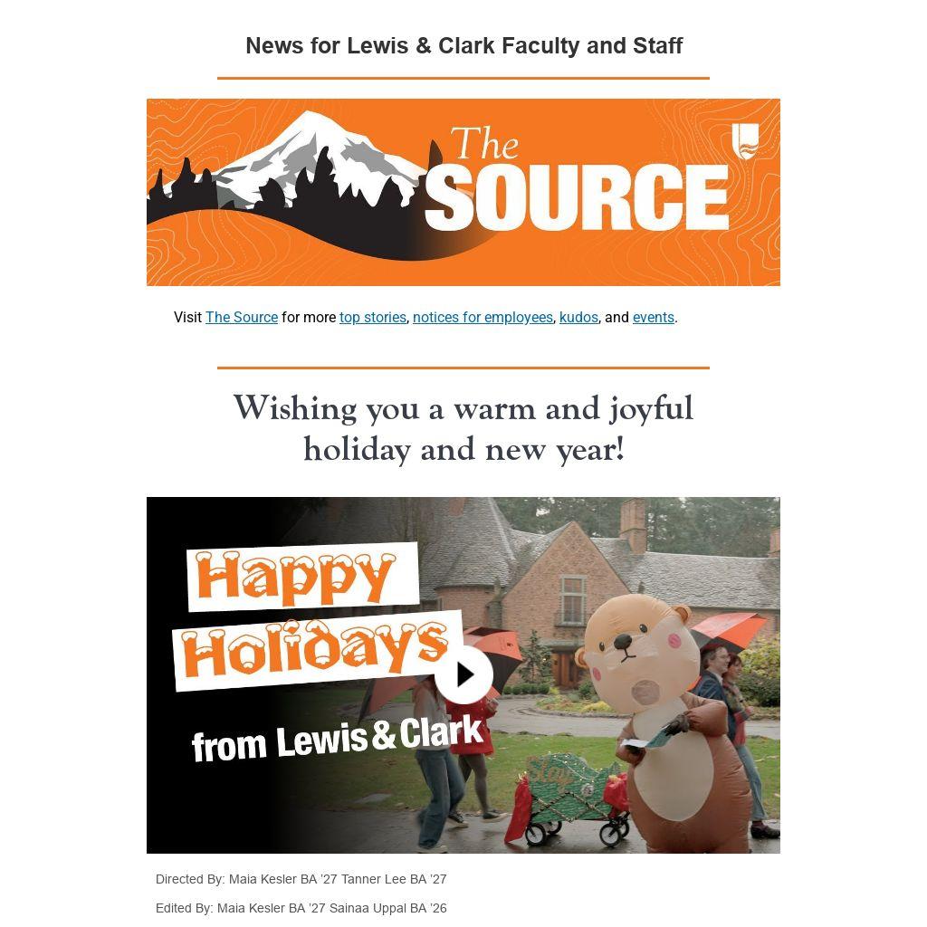 The Source is produced by Lewis & Clark's Office of Communications, and is distributed weekly to lc-employees@lclark.edu. Please write to us with your ideas, stories, and events—including specific date requests for promotion. Although there is no option for employees to unsubscribe, please do not mark this email as spam as doing so may negatively impact Lewis & Clark's reputation with Google as a trustworthy sender. Learn more about Lewis & Clark’s efforts to protect the email reputation of our lclark.edu domain.