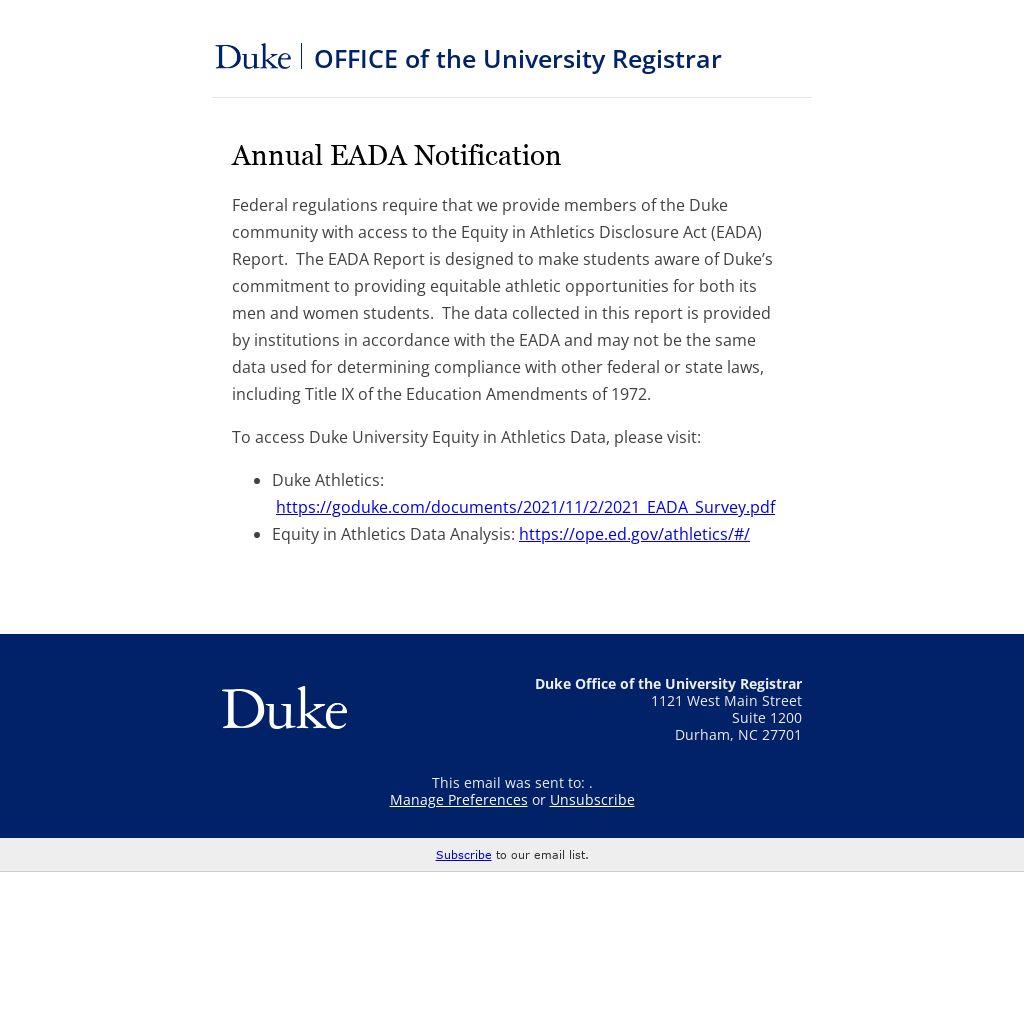 Federal regulations require that we provide members of the Duke community with access to the Equity in Athletics Disclosure Act (EADA) Report. The EADA Report is designed to make students aware of Duke’s commitment to providing equitable athletic opportunities for both its men and women students. The data collected in this report is provided by institutions in accordance with the EADA and may not be the same data used for determining compliance with other federal or state laws, including Title IX of the Education Amendments of 1972.