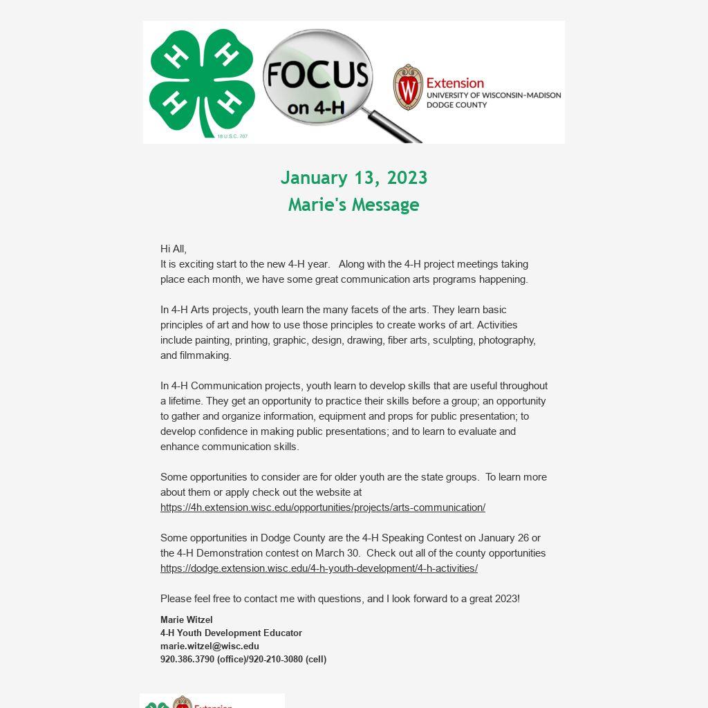 Marie Witzel 4-H Youth Development Educator marie.witzel@wisc.edu 920.386.3790 (office)/920-210-3080 (cell)