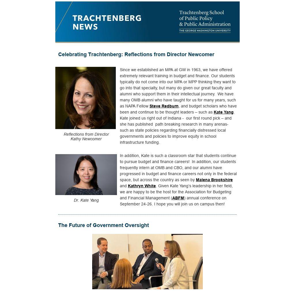 "We at the Trachtenberg School have been developing leaders in public service for decades. Now more than ever, our students must be prepared to navigate major shifts in how government operates, and we are ready to meet these challenges head-on. Situated in the heart of Washington, DC, we continue to leverage our location to collaborate with partners across the District and beyond." - Director Kathryn Newcomer