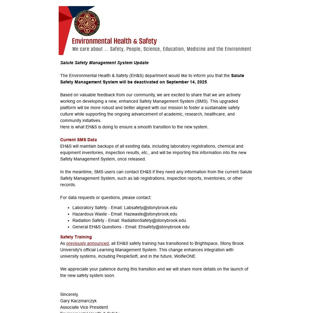 The Environmental Health & Safety (EH&S) department would like to inform you that the Salute Safety Management System will be deactivated on September 14, 2025.