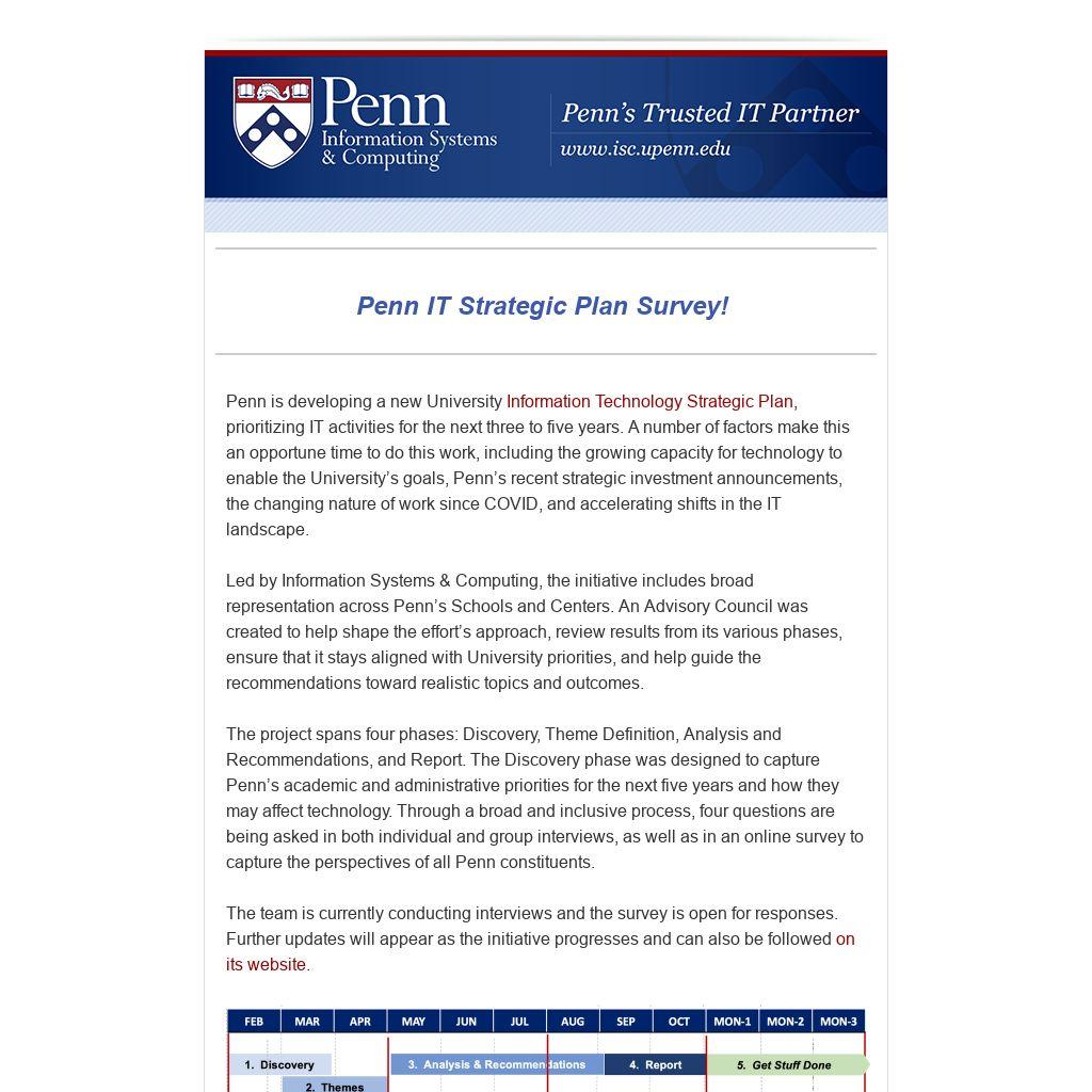 Information Technology Strategic Plan, prioritizing IT activities for the next three to five years. A number of factors make this an opportune time to do this work, including the growing capacity for technology to enable the University’s goals, Penn’s recent strategic investment announcements, the changing nature of work since COVID, and accelerating shifts in the IT landscape.
