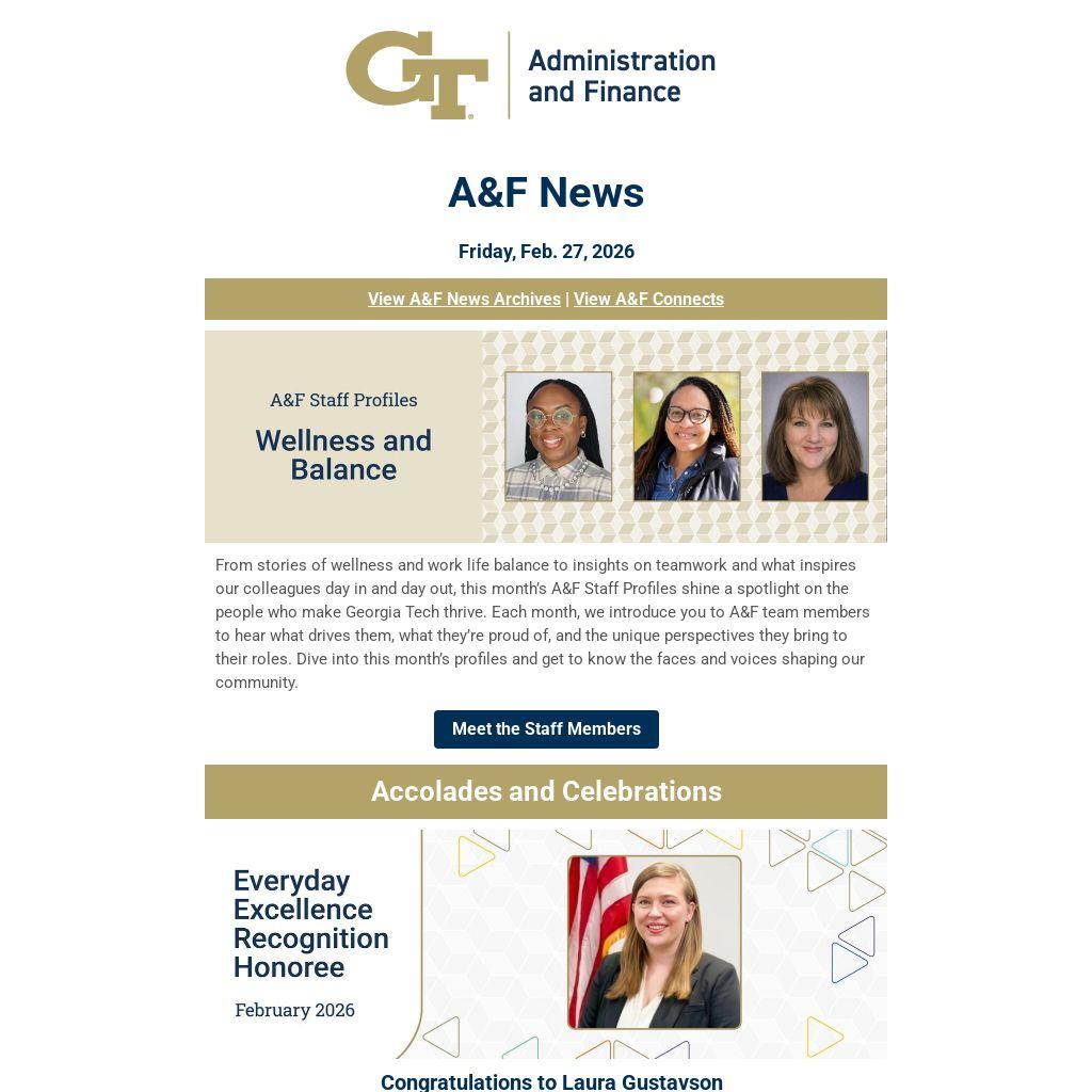 From stories of wellness and work life balance to insights on teamwork and what inspires our colleagues day in and day out, this month’s A&F Staff Profiles shine a spotlight on the people who make Georgia Tech thrive. Each month, we introduce you to A&F team members to hear what drives them, what they’re proud of, and the unique perspectives they bring to their roles. Dive into this month’s profiles and get to know the faces and voices shaping our community.