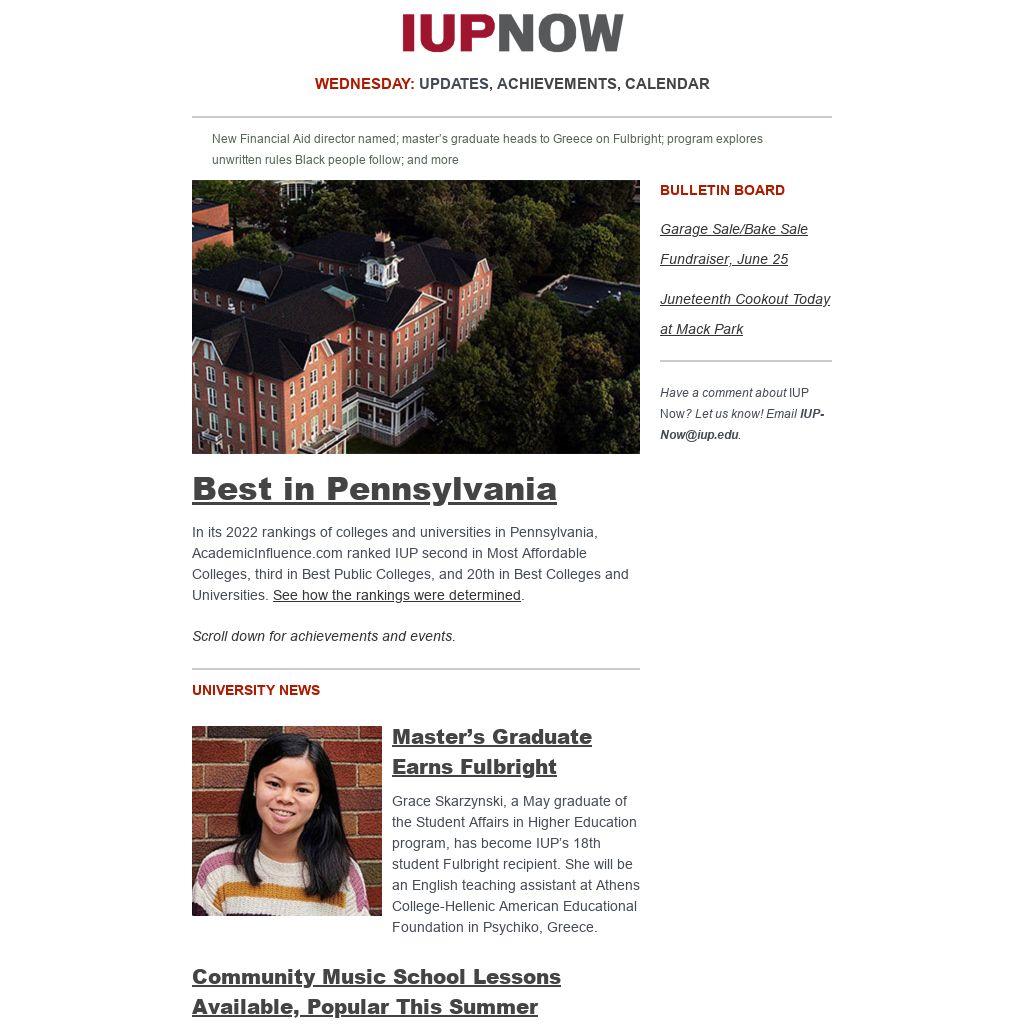 Distributed to IUP employees and students once a week on its summer schedule, IUP Now is the official newsletter of Indiana University of Pennsylvania. It features news from across the IUP website, compiled by the Division of Marketing and Communications. Find out how to get your news and events in IUP Now.