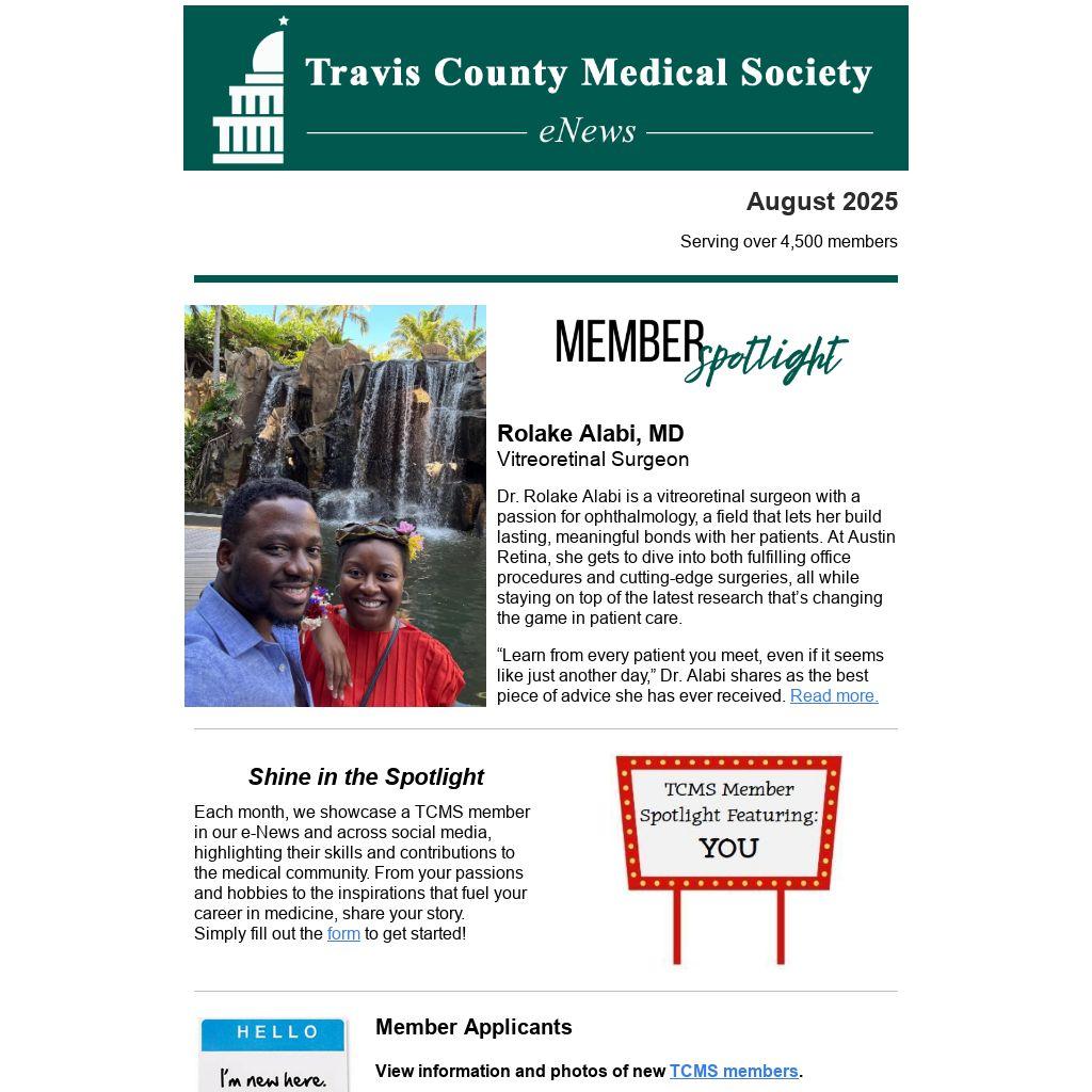 Each month, we showcase a TCMS member in our e-News and across social media, highlighting their skills and contributions to the medical community. From your passions and hobbies to the inspirations that fuel your career in medicine, share your story.