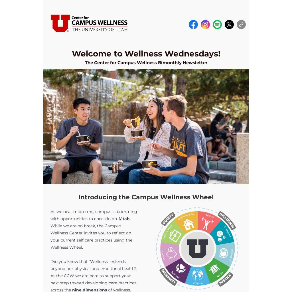 As we near midterms, campus is brimming with opportunities to check in on U-tah. While we are on break, the Campus Wellness Center invites you to reflect on your current self care practices using the Wellness Wheel.
