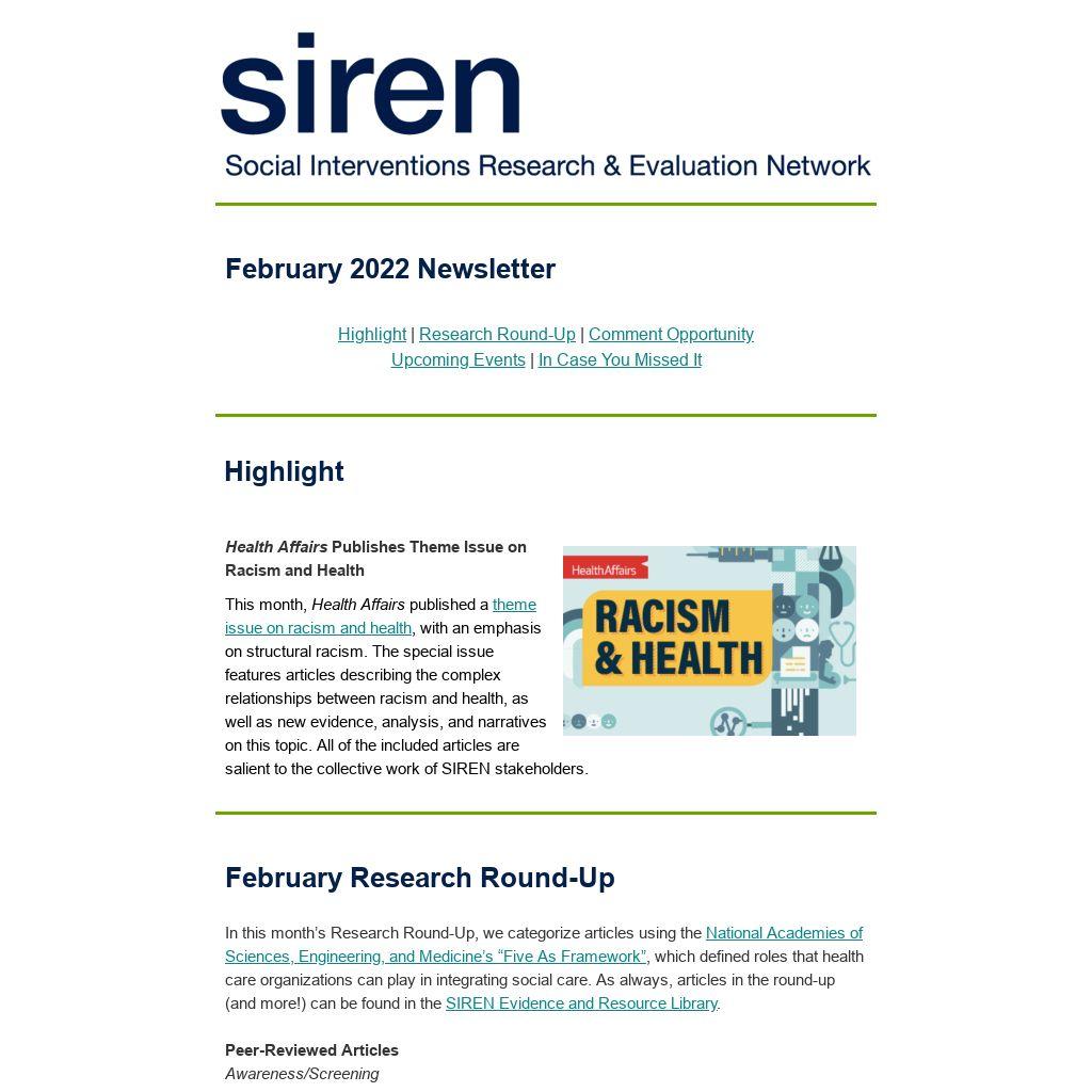 This month, Health Affairs published a theme issue on racism and health, with an emphasis on structural racism. The special issue features articles describing the complex relationships between racism and health, as well as new evidence, analysis, and narratives on this topic. All of the included articles are salient to the collective work of SIREN stakeholders.