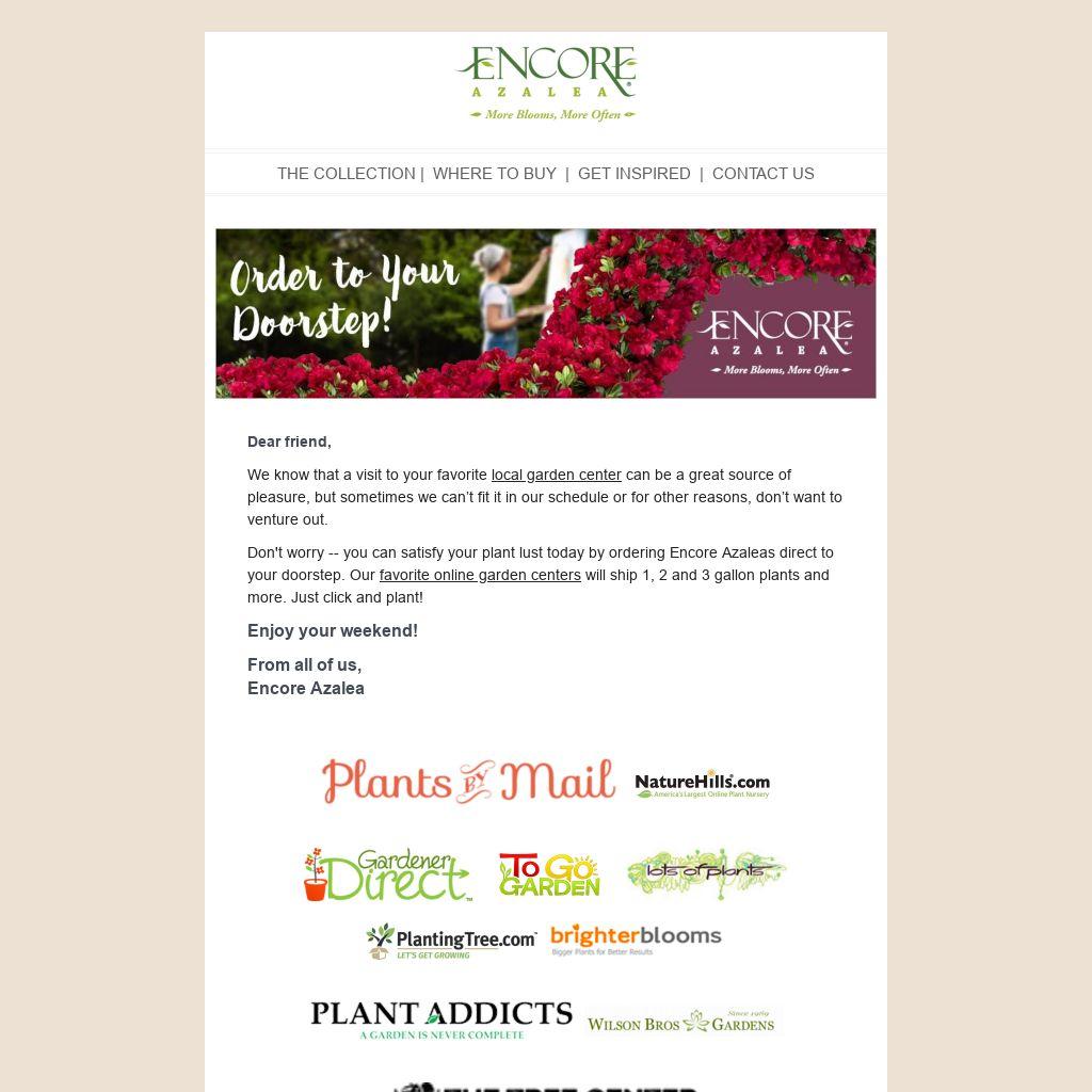 Don't worry -- you can satisfy your plant lust today by ordering Encore Azaleas direct to your doorstep. Our favorite online garden centers will ship 1, 2 and 3 gallon plants and more. Just click and plant!