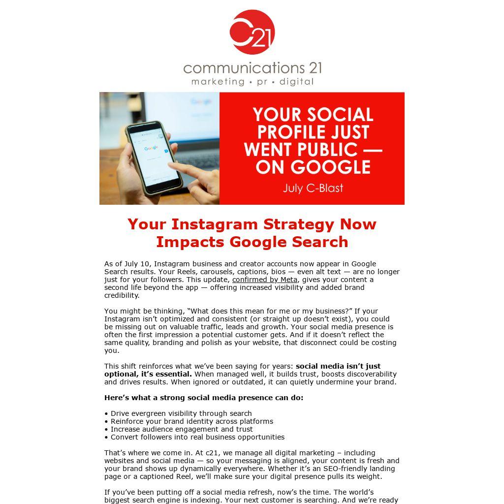 That’s where we come in. At c21, we manage all digital marketing – including websites and social media — so your messaging is aligned, your content is fresh and your brand shows up dynamically everywhere. Whether it’s an SEO-friendly landing page or a captioned Reel, we’ll make sure your digital presence pulls its weight.
