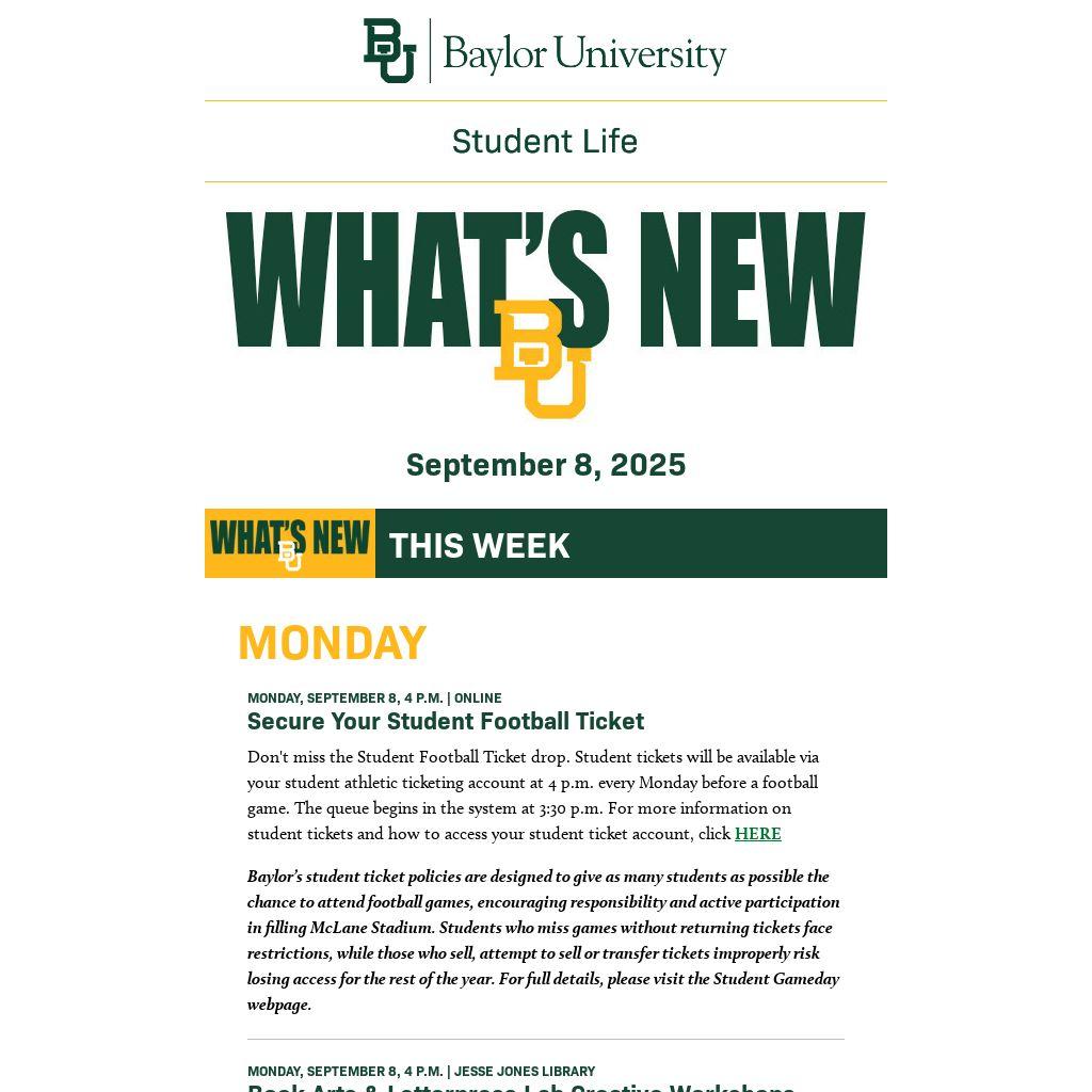 If you are a department or Baylor student organization and have items you would like to see appear in What's New BU, submit them for consideration by Friday at 8 a.m. by clicking here or emailing them to whatsnew@baylor.edu. View past issues of What’s New BU here.