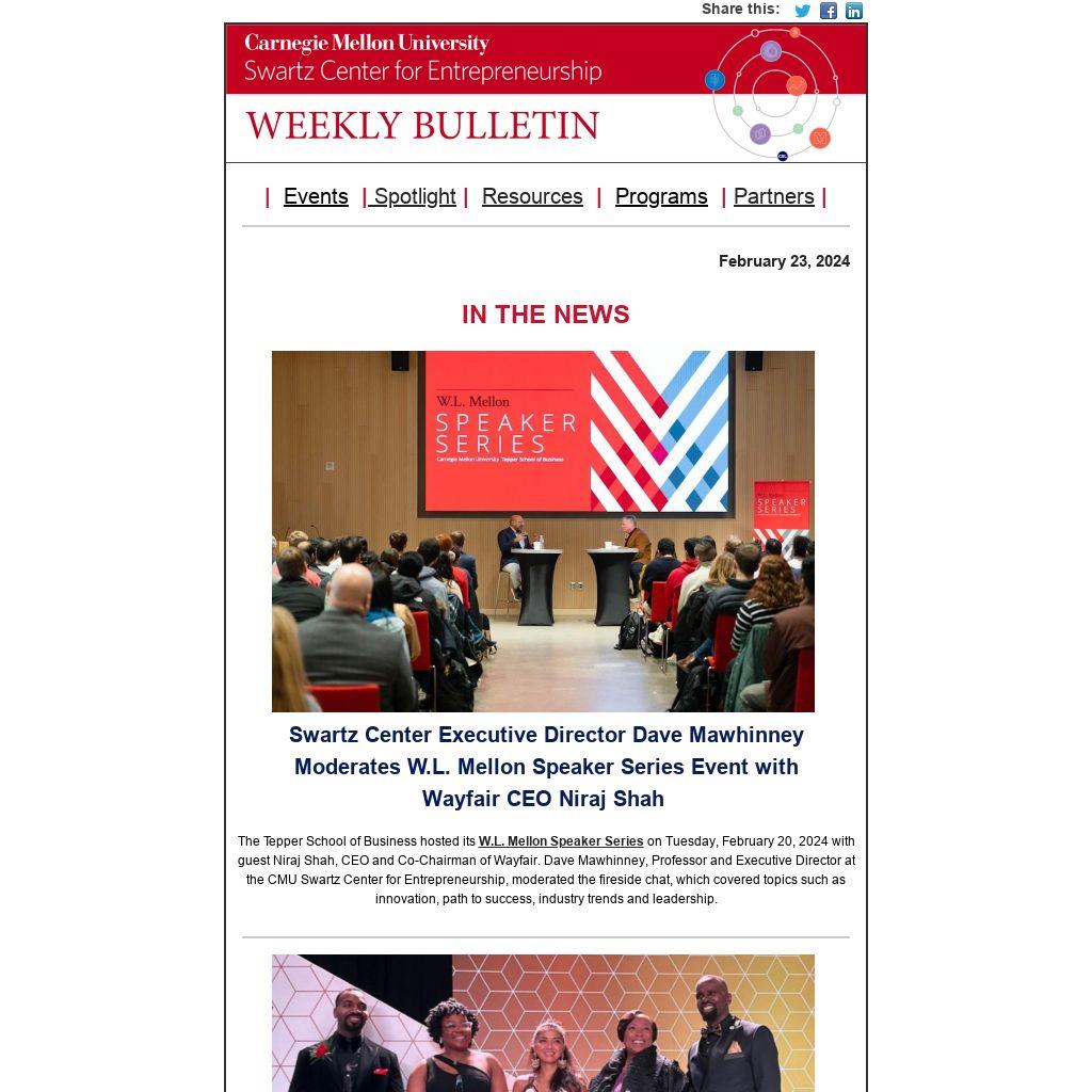 Have startup news or opportunities to share? Have questions about the Swartz Center Weekly Bulletin? Send news, opportunities or questions to Sonya Ford, Program Manager.