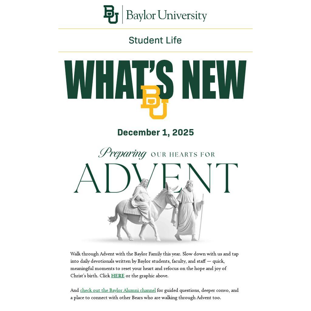 Walk through Advent with the Baylor Family this year. Slow down with us and tap into daily devotionals written by Baylor students, faculty, and staff — quick, meaningful moments to reset your heart and refocus on the hope and joy of Christ’s birth. Click HERE or the graphic above.