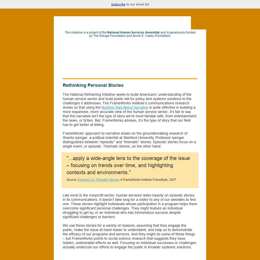 The National Reframing Initiative seeks to build Americans’ understanding of the human service sector and build public will for policy and systems solutions to the challenges it addresses. The FrameWorks Institute’s communications research shows us that using the Building Well-Being Narrative is quite effective in building a more expansive, more accurate view of the human service sector. It’s fair to say that this narrative isn’t the type of story we’re most familiar with, from entertainment, the news, or fiction. But, FrameWorks advises, it’s the type of story that our field has to get better at telling.