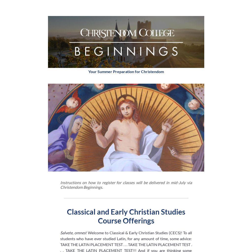 Instructions on how to register for classes will be delivered in mid-July via Christendom Beginnings.