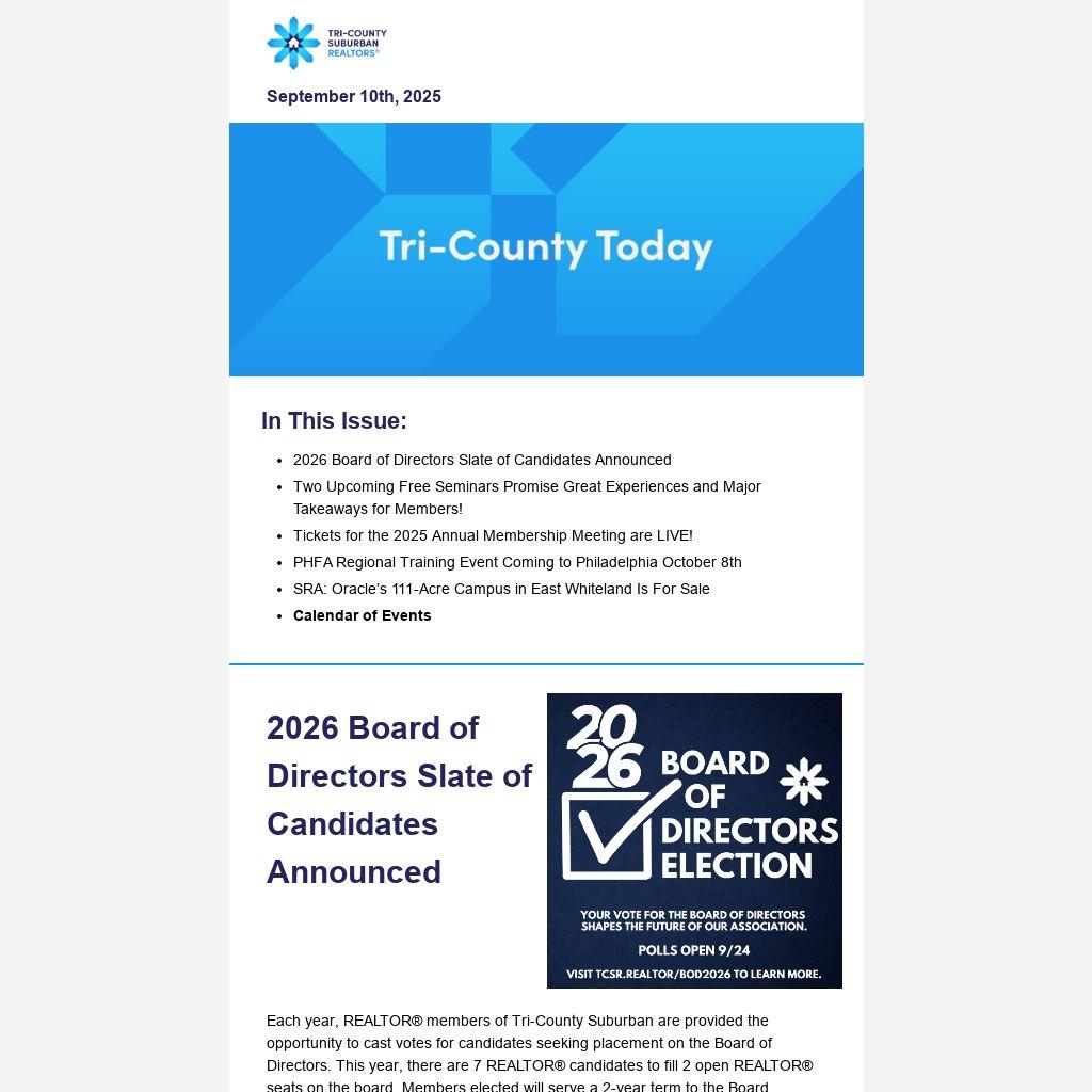 For the 2026 election, the online polls (via associationvoting.com) will open on Thursday, September 24th via an email notification will be sent to every REALTOR® member. The election will conclude at the 2025 Annual Membership Meeting scheduled for Wednesday, October 22nd. Members may submit votes online until 1:00pm on Wednesday, October 22nd, or vote in-person at the Annual Membership Meeting.