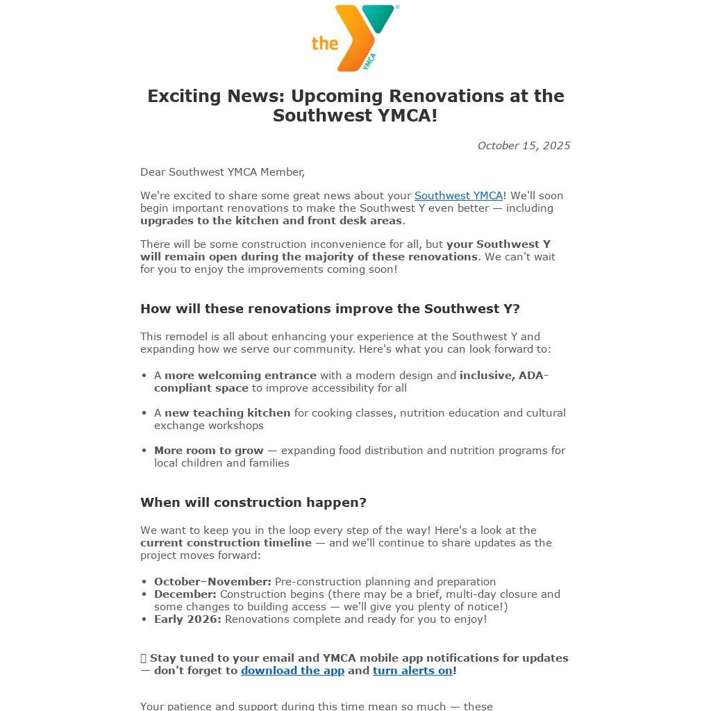 There will be some construction inconvenience for all, but your Southwest Y will remain open during the majority of these renovations. We can't wait for you to enjoy the improvements coming soon!
