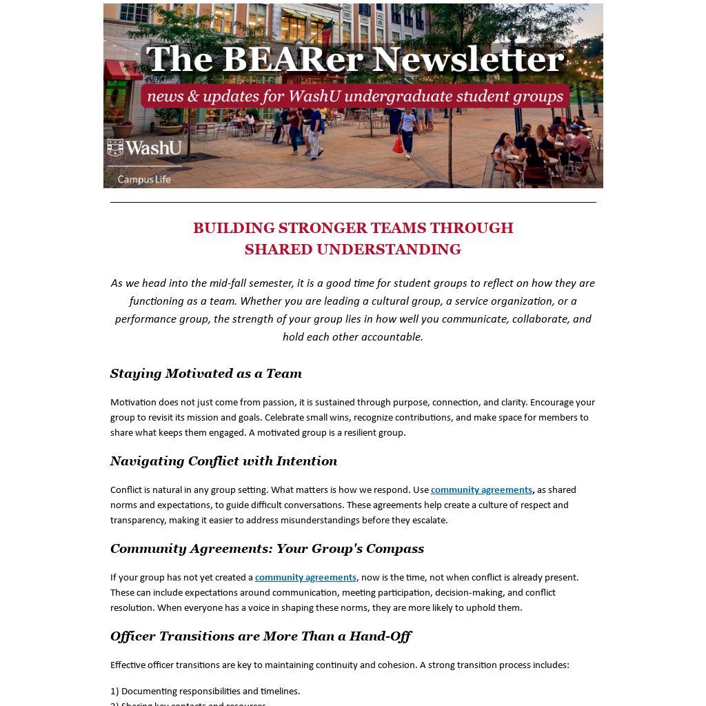 As we head into the mid-fall semester, it is a good time for student groups to reflect on how they are functioning as a team. Whether you are leading a cultural group, a service organization, or a performance group, the strength of your group lies in how well you communicate, collaborate, and hold each other accountable.