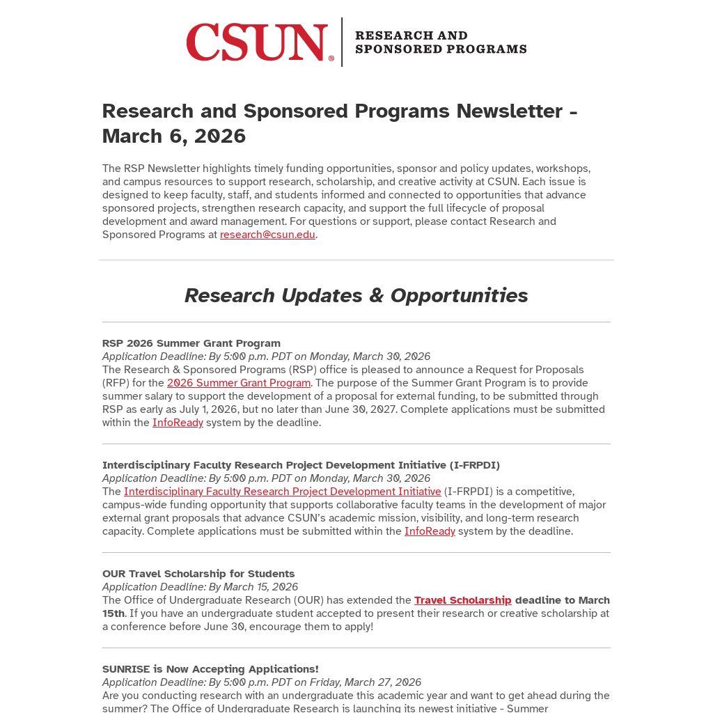 The RSP Newsletter highlights timely funding opportunities, sponsor and policy updates, workshops, and campus resources to support research, scholarship, and creative activity at CSUN. Each issue is designed to keep faculty, staff, and students informed and connected to opportunities that advance sponsored projects, strengthen research capacity, and support the full lifecycle of proposal development and award management. For questions or support, please contact Research and Sponsored Programs at research@csun.edu.