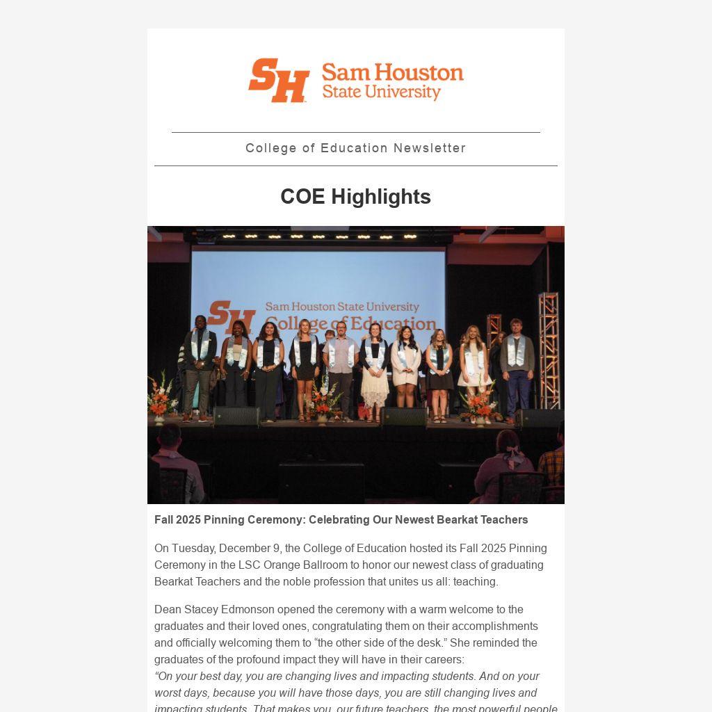 On Tuesday, December 9, the College of Education hosted its Fall 2025 Pinning Ceremony in the LSC Orange Ballroom to honor our newest class of graduating Bearkat Teachers and the noble profession that unites us all: teaching.