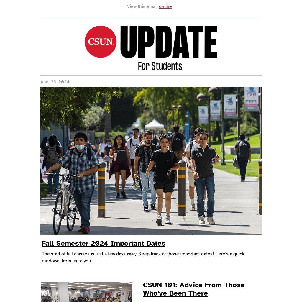 | Summer Term 2024 ends today (Aug. 20). You may view grades for all summer session courses in the CSUN Portal starting today.