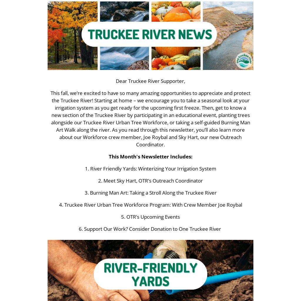This fall, we’re excited to have so many amazing opportunities to appreciate and protect the Truckee River! Starting at home – we encourage you to take a seasonal look at your irrigation system as you get ready for the upcoming first freeze. Then, get to know a new section of the Truckee River by participating in an educational event, planting trees alongside our Truckee River Urban Tree Workforce, or taking a self-guided Burning Man Art Walk along the river. As you read through this newsletter, you’ll also learn more about our Workforce crew member, Joe Roybal and Sky Hart, our new Outreach Coordinator.