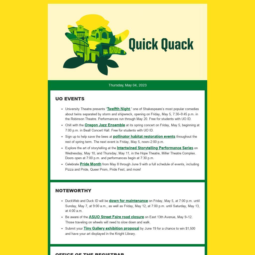- DuckWeb and Duck ID will be down for maintenance on Friday, May 5, at 7:00 p.m. until Sunday, May 7, at 9:00 a.m., as well as Friday, May 12, at 7:00 p.m. until Saturday, May 13, at 4:00 a.m.