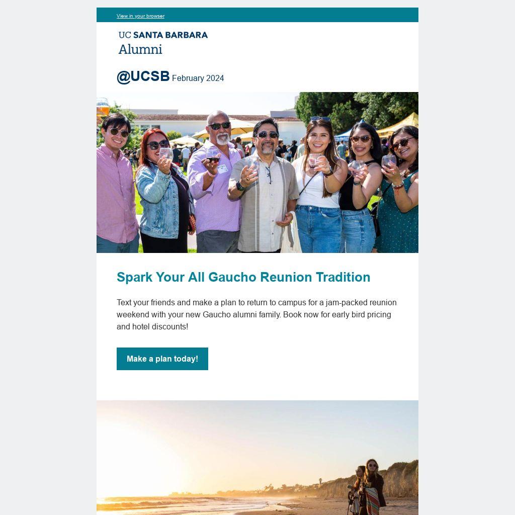 Text your friends and make a plan to return to campus for a jam-packed reunion weekend with your new Gaucho alumni family. Book now for early bird pricing and hotel discounts!