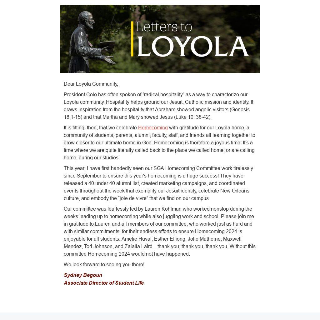 This year, I have first-handedly seen our SGA Homecoming Committee work tirelessly since September to ensure this year's homecoming is a huge success! They have released a 40 under 40 alumni list, created marketing campaigns, and coordinated events throughout the week that exemplify our Jesuit identity, celebrate New Orleans culture, and embody the “joie de vivre” that we find on our campus.