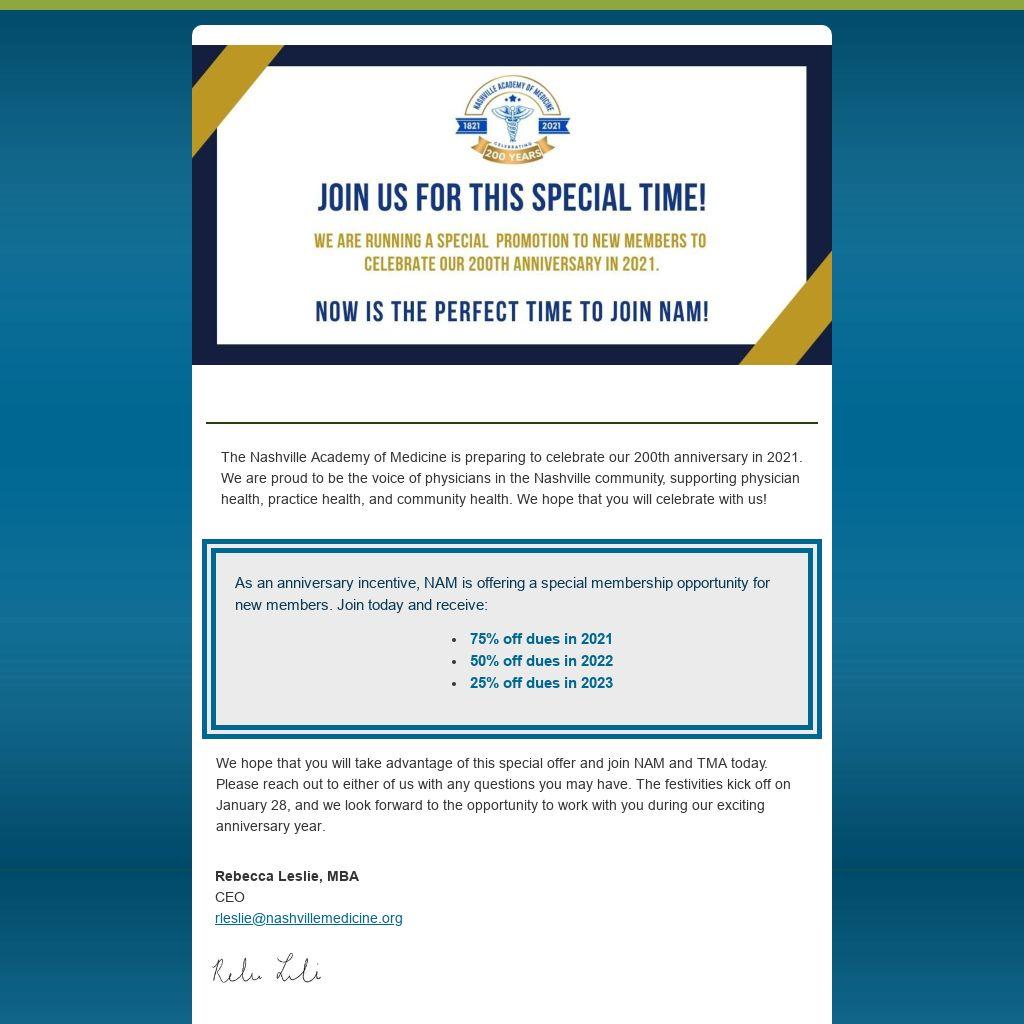 The Nashville Academy of Medicine is preparing to celebrate our 200th anniversary in 2021. We are proud to be the voice of physicians in the Nashville community, supporting physician health, practice health, and community health. We hope that you will celebrate with us!