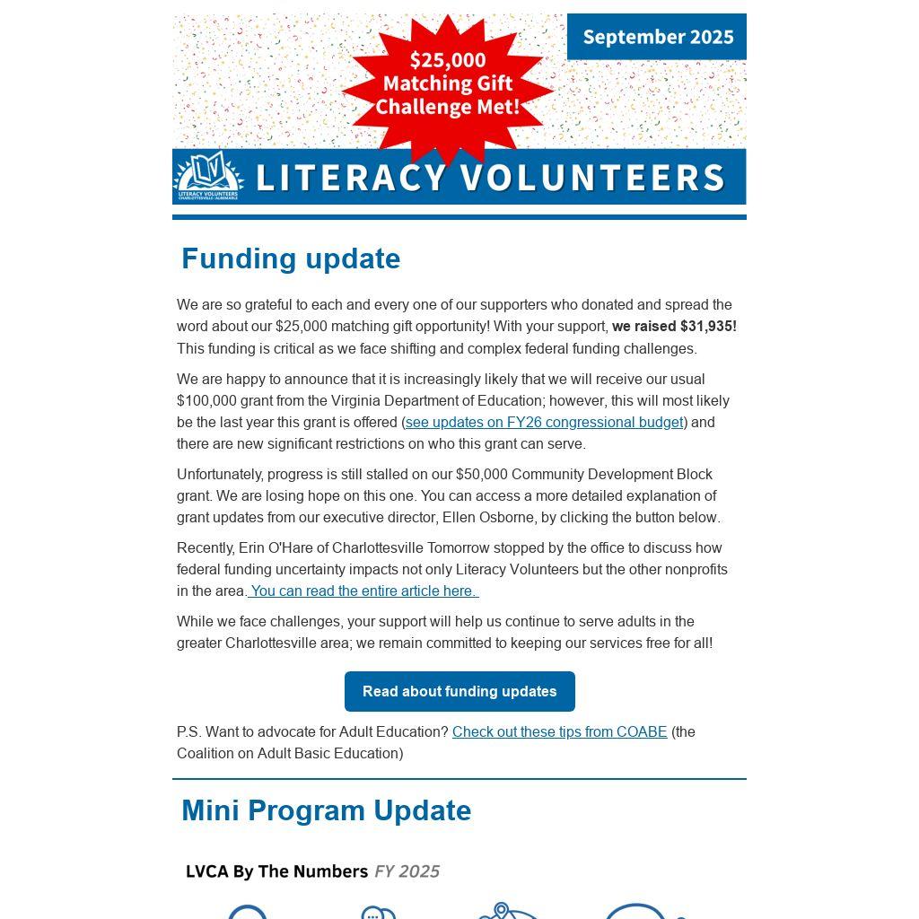Recently, Erin O'Hare of Charlottesville Tomorrow stopped by the office to discuss how federal funding uncertainty impacts not only Literacy Volunteers but the other nonprofits in the area. You can read the entire article here.