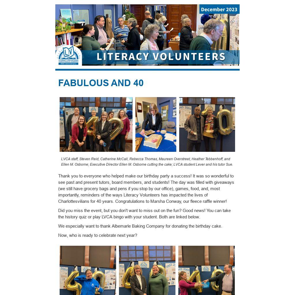 Thank you to everyone who helped make our birthday party a success! It was so wonderful to see past and present tutors, board members, and students! The day was filled with giveaways (we still have grocery bags and pens if you stop by our office), games, food, and, most importantly, reminders of the ways Literacy Volunteers has impacted the lives of Charlottesvilians for 40 years. Congratulations to Marsha Conway, our fleece raffle winner!