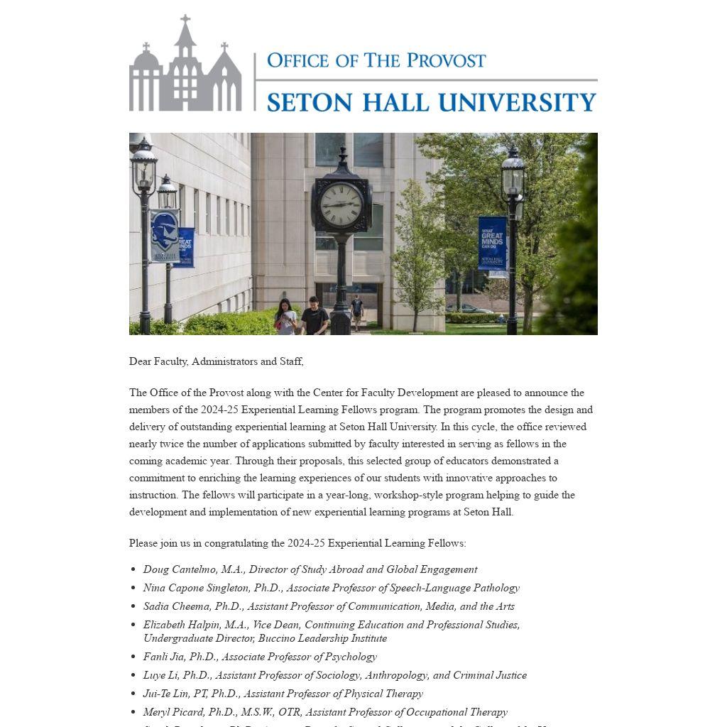 The Office of the Provost along with the Center for Faculty Development are pleased to announce the members of the 2024-25 Experiential Learning Fellows program. The program promotes the design and delivery of outstanding experiential learning at Seton Hall University. In this cycle, the office reviewed nearly twice the number of applications submitted by faculty interested in serving as fellows in the coming academic year. Through their proposals, this selected group of educators demonstrated a commitment to enriching the learning experiences of our students with innovative approaches to instruction. The fellows will participate in a year-long, workshop-style program helping to guide the development and implementation of new experiential learning programs at Seton Hall.