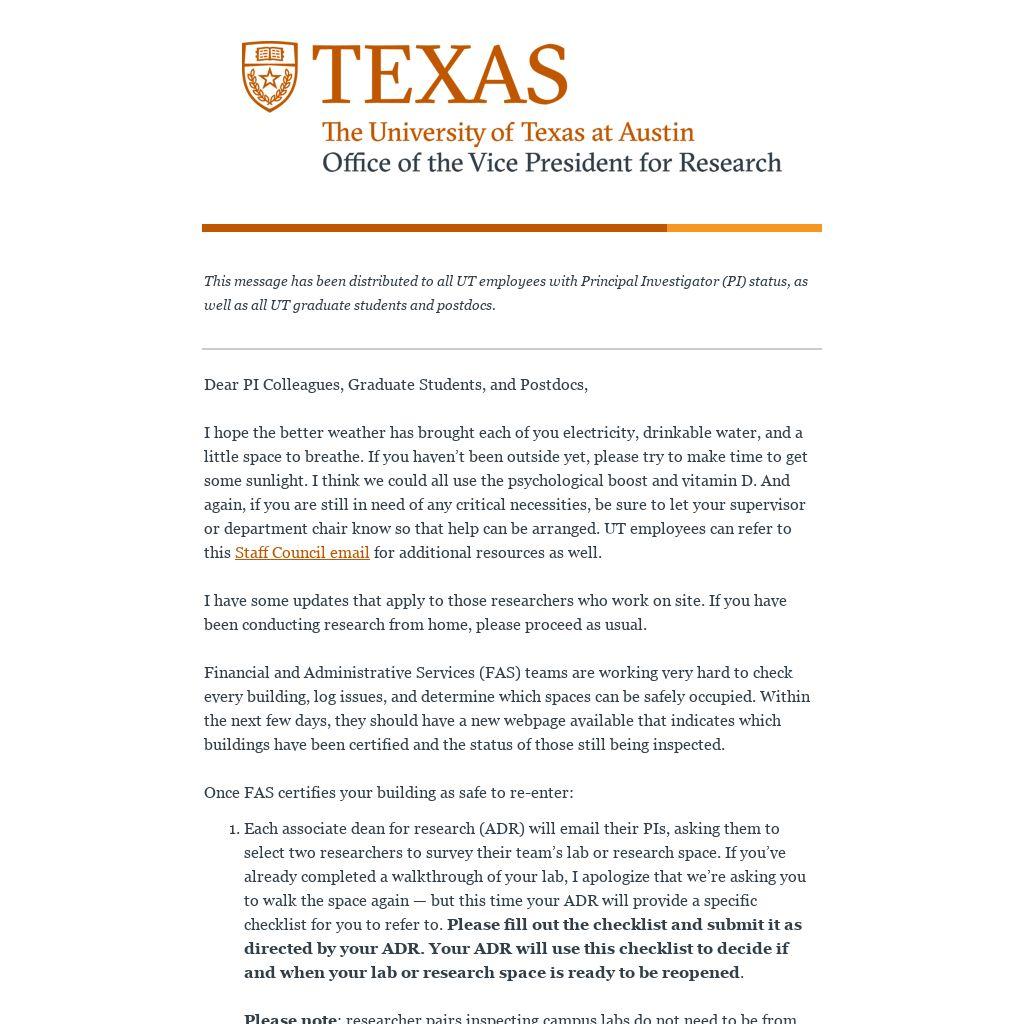 - Each associate dean for research (ADR) will email their PIs, asking them to select two researchers to survey their team’s lab or research space. If you’ve already completed a walkthrough of your lab, I apologize that we’re asking you to walk the space again — but this time your ADR will provide a specific checklist for you to refer to. Please fill out the checklist and submit it as directed by your ADR. Your ADR will use this checklist to decide if and when your lab or research space is ready to be reopened.