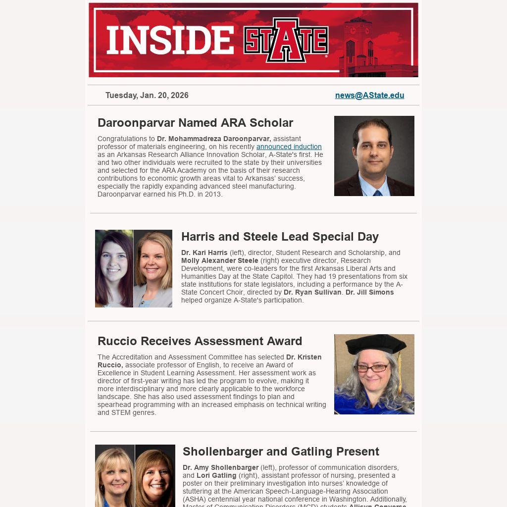 Congratulations to Dr. Mohammadreza Daroonparvar, assistant professor of materials engineering, on his recently announced induction as an Arkansas Research Alliance Innovation Scholar, A-State's first. He and two other individuals were recruited to the state by their universities and selected for the ARA Academy on the basis of their research contributions to economic growth areas vital to Arkansas’ success, especially the rapidly expanding advanced steel manufacturing. Daroonparvar earned his Ph.D. in 2013.
