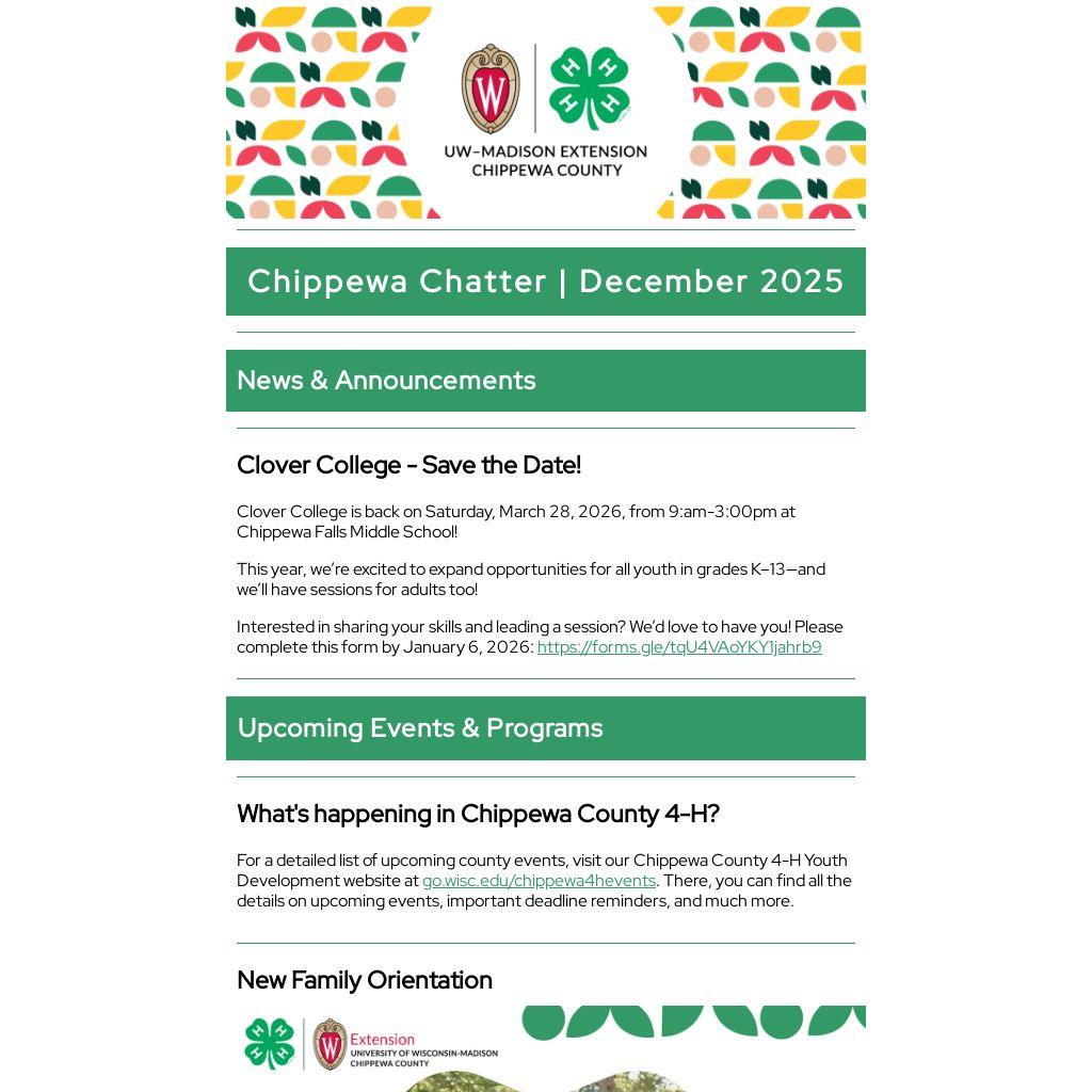 Join Jordan Blue, Chippewa County 4-H Program Educator, for an interactive session designed to help you learn all about 4-H in our community. During this session, we’ll explore what 4-H is and how it works locally, who to contact for support, resources available through the Extension Office, tips for navigating the 4-H website, and opportunities for awards and achievement. Whether you’re new to 4-H or looking to get more involved, this is your chance to ask questions and connect! Date & Time: January 7 at 6:30pm | Register here!