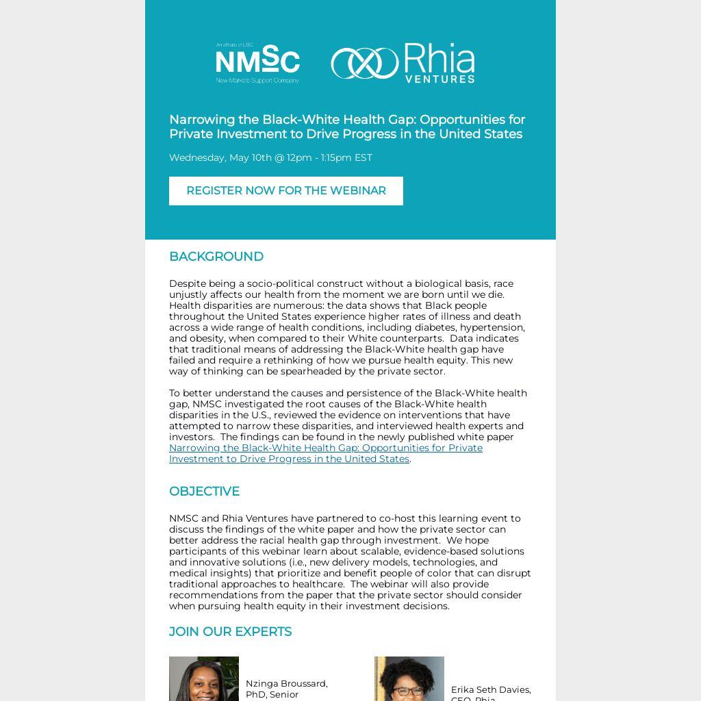 NMSC and Rhia Ventures have partnered to co-host this learning event to discuss the findings of the white paper and how the private sector can better address the racial health gap through investment. We hope participants of this webinar learn about scalable, evidence-based solutions and innovative solutions (i.e., new delivery models, technologies, and medical insights) that prioritize and benefit people of color that can disrupt traditional approaches to healthcare. The webinar will also provide recommendations from the paper that the private sector should consider when pursuing health equity in their investment decisions.