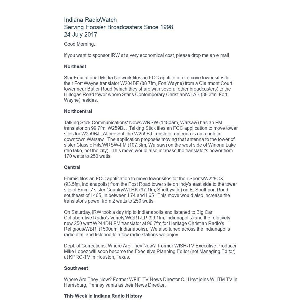 Indiana RadioWatch subscriptions are free. To subscribe, send an e-mail to irw@well.com and we'll add you. After publication, we archive Indiana RadioWatch on the Indiana Radio Archive at http://www.indianaradio.net. Please e-mail us your news stories and employment opportunities.