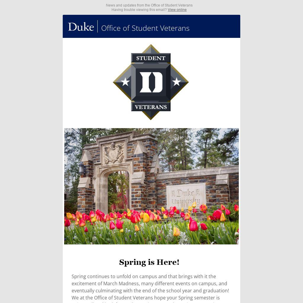 Spring is Here! Spring continues to unfold on campus and that brings with it the excitement of March Madness, many different events on campus, and eventually culminating with the end of the school year and graduation! We at the Office of Student Veterans hope your Spring semester is going well and look forward to seeing you at the various upcoming events on campus!