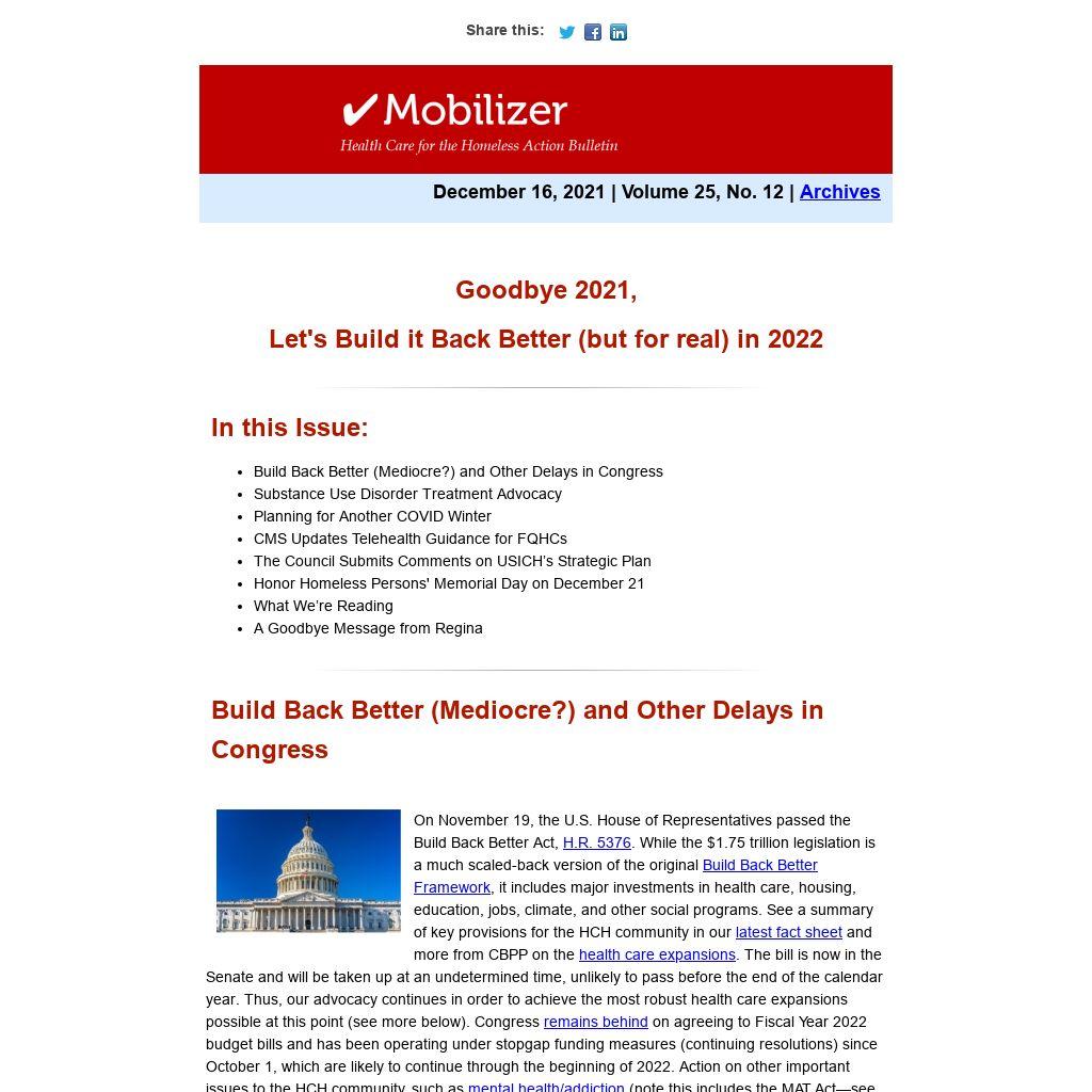 On November 19, the U.S. House of Representatives passed the Build Back Better Act, H.R. 5376. While the $1.75 trillion legislation is a much scaled-back version of the original Build Back Better Framework, it includes major investments in health care, housing, education, jobs, climate, and other social programs. See a summary of key provisions for the HCH community in our latest fact sheet and more from CBPP on the health care expansions. The bill is now in the Senate and will be taken up at an undetermined time, unlikely to pass before the end of the calendar year. Thus, our advocacy continues in order to achieve the most robust health care expansions possible at this point (see more below). Congress remains behind on agreeing to Fiscal Year 2022 budget bills and has been operating under stopgap funding measures (continuing resolutions) since October 1, which are likely to continue through the beginning of 2022. Action on other important issues to the HCH community, such as mental health/addiction (note this includes the MAT Act—see below) are on the table, but have seen no substantive progress. Stay tuned to future Mobilizers for how to Take Action.