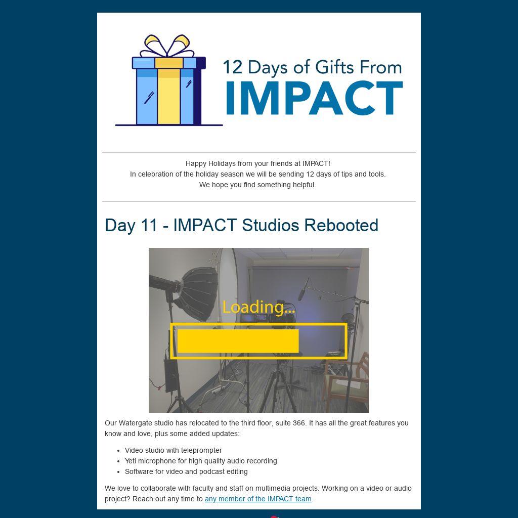 Happy Holidays from your friends at IMPACT! In celebration of the holiday season we will be sending 12 days of tips and tools. We hope you find something helpful.