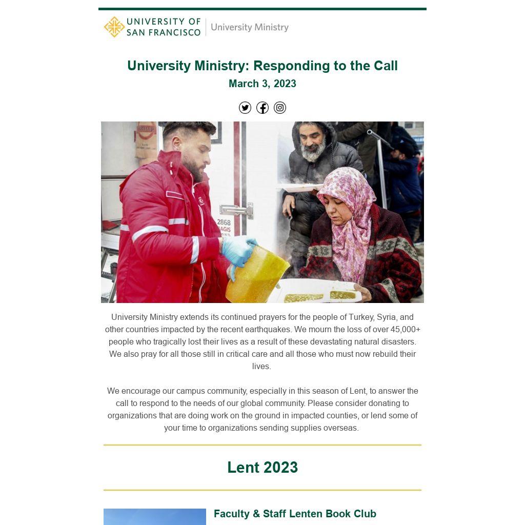 University Ministry extends its continued prayers for the people of Turkey, Syria, and other countries impacted by the recent earthquakes. We mourn the loss of over 45,000+ people who tragically lost their lives as a result of these devastating natural disasters. We also pray for all those still in critical care and all those who must now rebuild their lives.